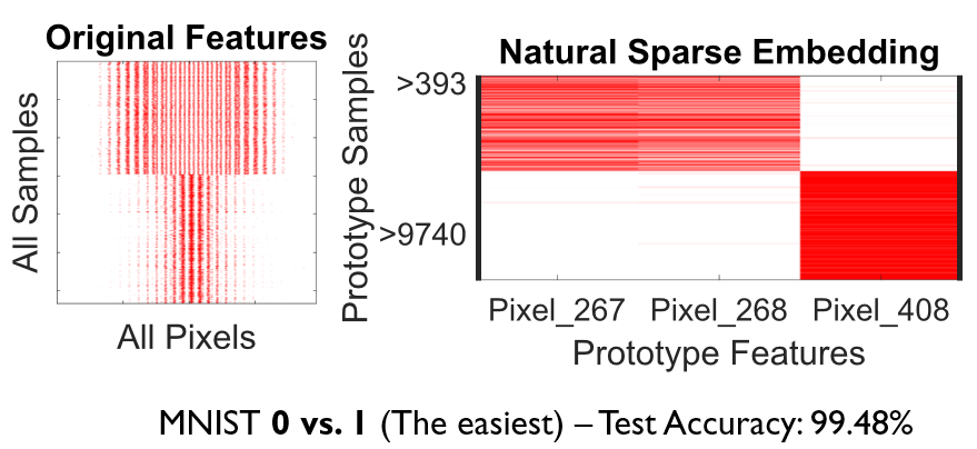 Natural Learning stands as the sole algorithm capable of uncovering sparse prototypes across both sample and feature dimensions concurrently. In this example, NL effectively pinpoints two prototype patients, one from colon cancer and one from its counterpart class, while highlighting only three crucial genes that define these prototypes. No other machine learning algorithm can achieve such remarkable performance in identifying a compact subspace within the training set, endowed with such potent discriminatory capacity. Click on the "Demo" menu for more examples.